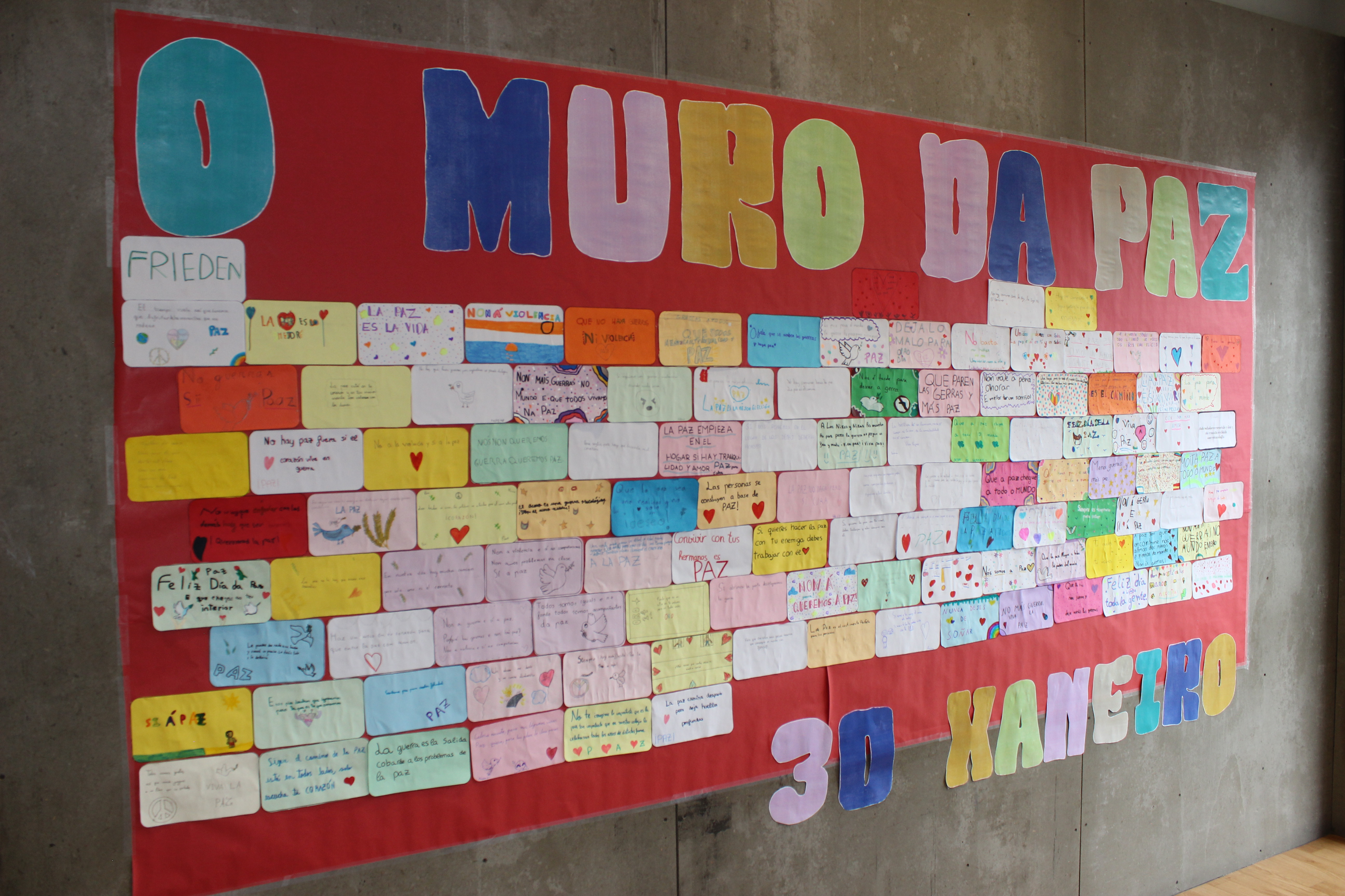 Two murals were also made, one in which symbols of peace and love rained down and another entitled "The Wall of Peace", in which the students each placed a block with a positive message to build this wall against intolerance and violence.